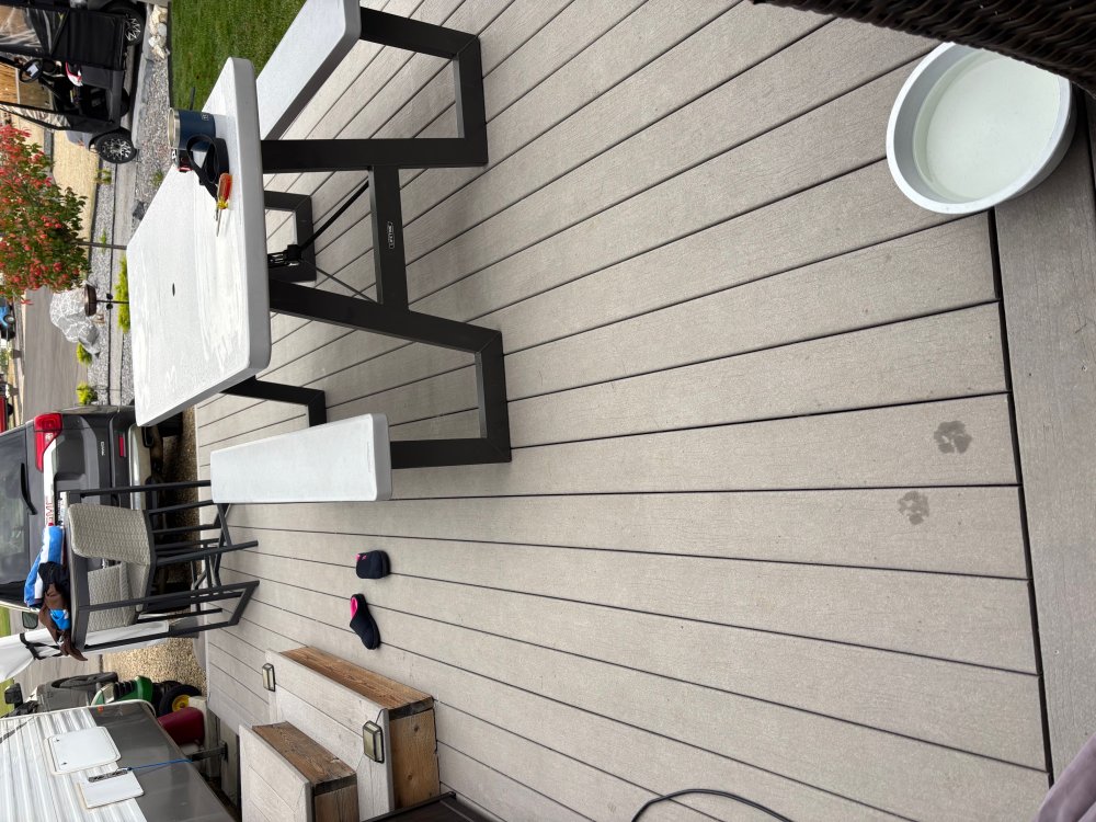 Composite decks for sale $1750 - 20'x11'-4 2 decks for sale - All framing is 2x10 pressure treated c/w flush beams, Moisture shield composite decking in Cottage grey c/w mitered picture framed perimeter deck boards.
